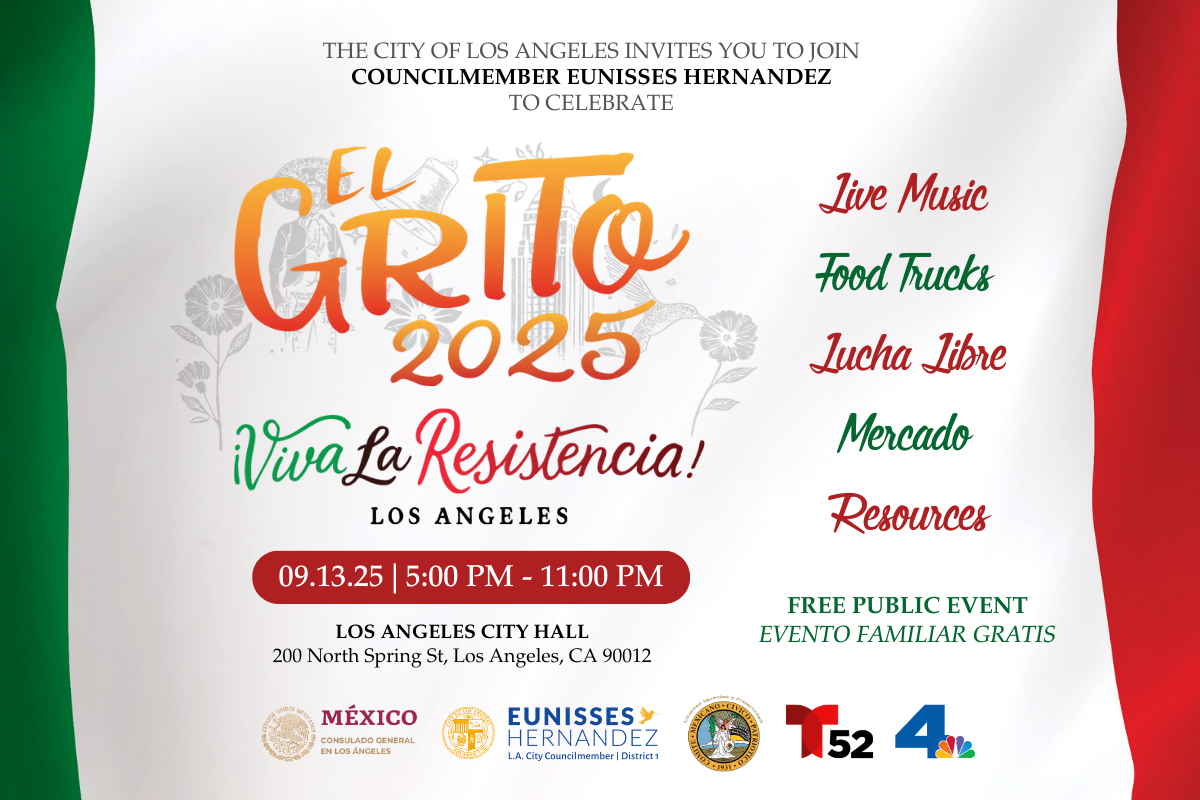 Saturday September 13th from 5 PM – 11 PM, you are invited to City Hall (200 N Spring St) at Gloria Molina Grand Park for one of Los Angeles’ most beloved traditions: El Grito de Dolores. For over 30 years, the Celebration of El Grito at City Hall has brought thousands together. During a time when many in our Mexican and Latino communities continue to face uncertainty, El Grito 2025: ¡Viva La Resistencia! is a call to uplift tradition, celebrate resilience, and come together in joy and solidarity. Gloria Molina Grand Park will be activated for this free community event with live music, Lucha Libre, food, and family-friendly fun.